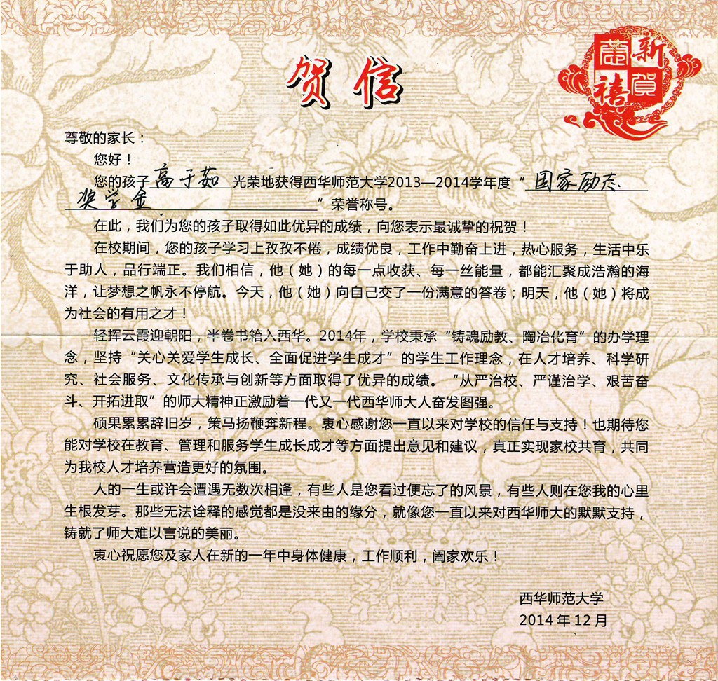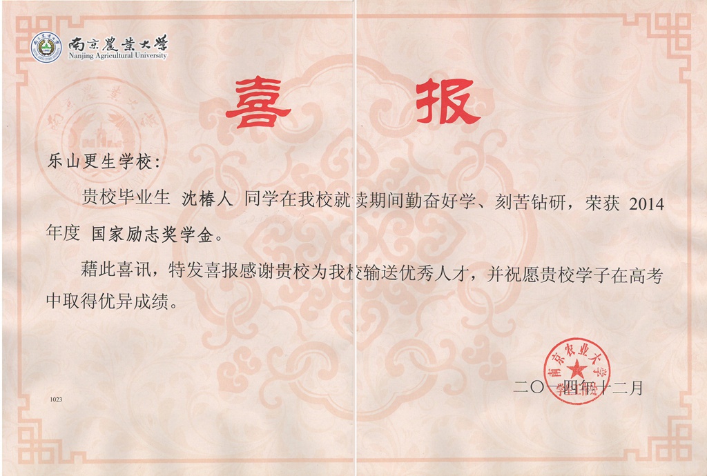 近日,更生學(xué)校收到南京農(nóng)業(yè)大學(xué),西華師范大學(xué)發(fā)來的喜報。我校高2012屆2班學(xué)生沈椿人,高2011屆3班學(xué)生高于茹分別榮獲南京農(nóng)業(yè)大學(xué)、西華師范大學(xué)2013—2014學(xué)年度國家勵志獎學(xué)金,兩所學(xué)校感謝我校為他們輸送了優(yōu)秀人才,向?qū)W校表示誠摯的祝賀,并祝愿更生學(xué)子在高考中取得優(yōu)異成績。